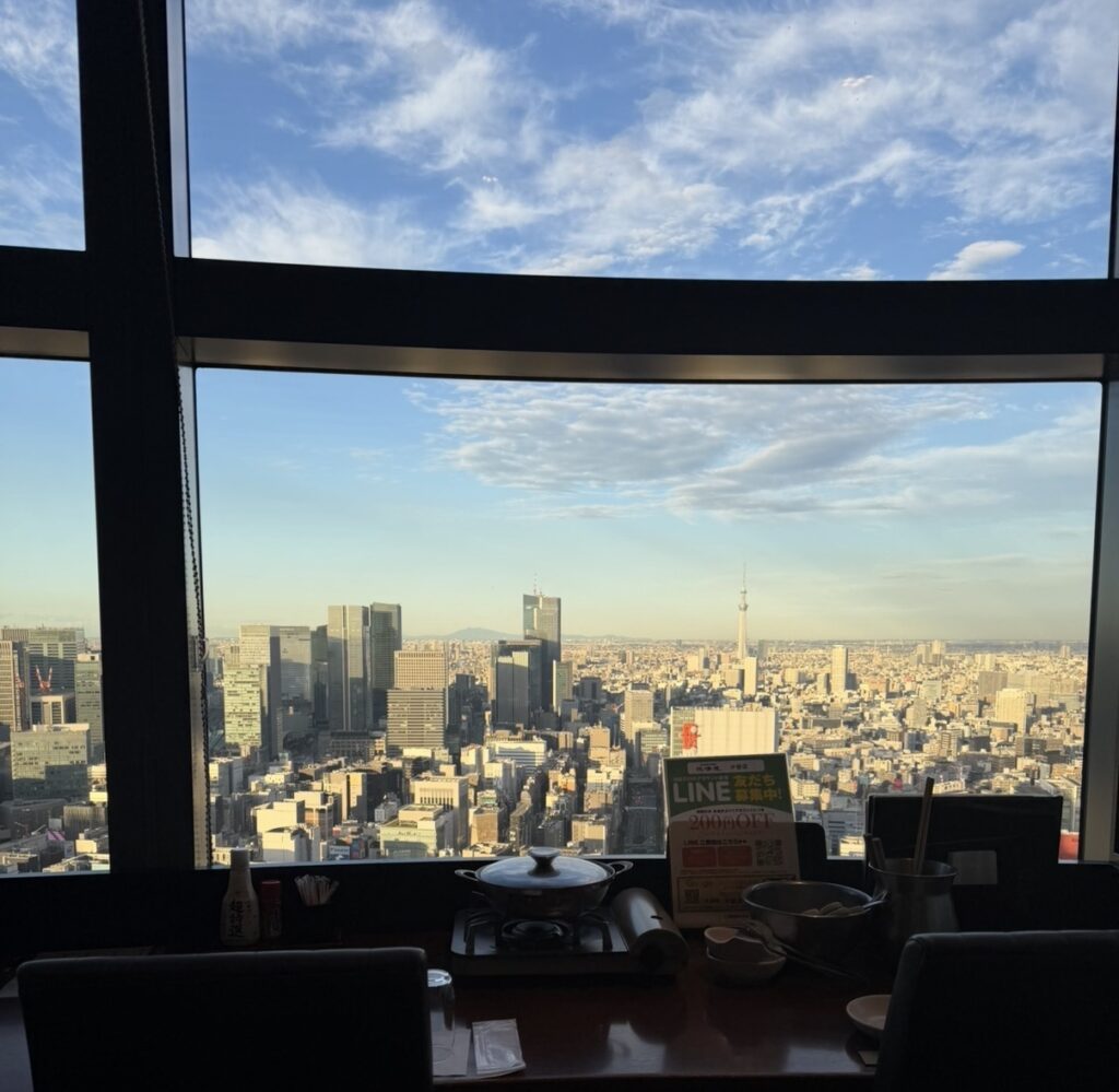 46階にあり、窓からの景色がとっても綺麗で、食事と一緒に贅沢な時間が楽しめるのが魅力なんです。東京には同系列の店舗がたくさんありますが、その中でも 個人的にいちばん好きな店舗 です。