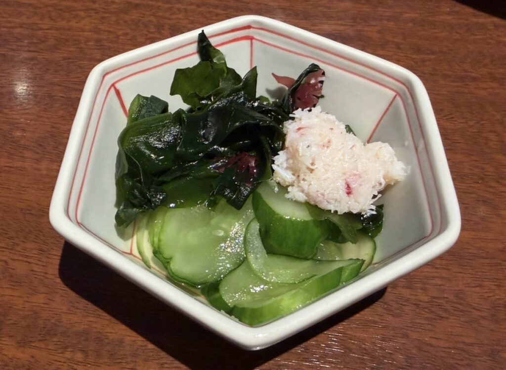 さっぱりしたきゅうりとわかめに、蟹の身が少し乗っていて嬉しい一品。