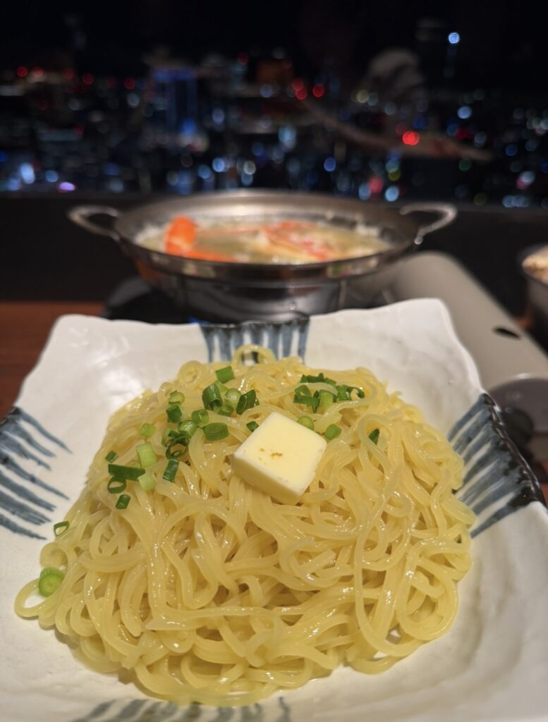 お刺身や天ぷら、蟹鍋、押し寿司、そしてまさかの締めラーメンまで付いて、ボリュームもしっかり。さらに46階から見える絶景の昼景・夕暮れ・夜景まで楽しめて、本当に特別な時間になりました。