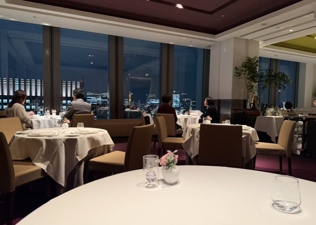 大きな窓からは東京の景色を一望でき、洗練された空間と美しい料理が魅力。