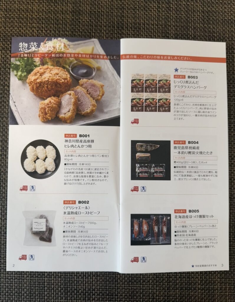 日本管財株主優待カタログ2ページ目 惣菜と食材(スモークサーモン、黒豚生姜焼き、明太子、ミニステーキなど)